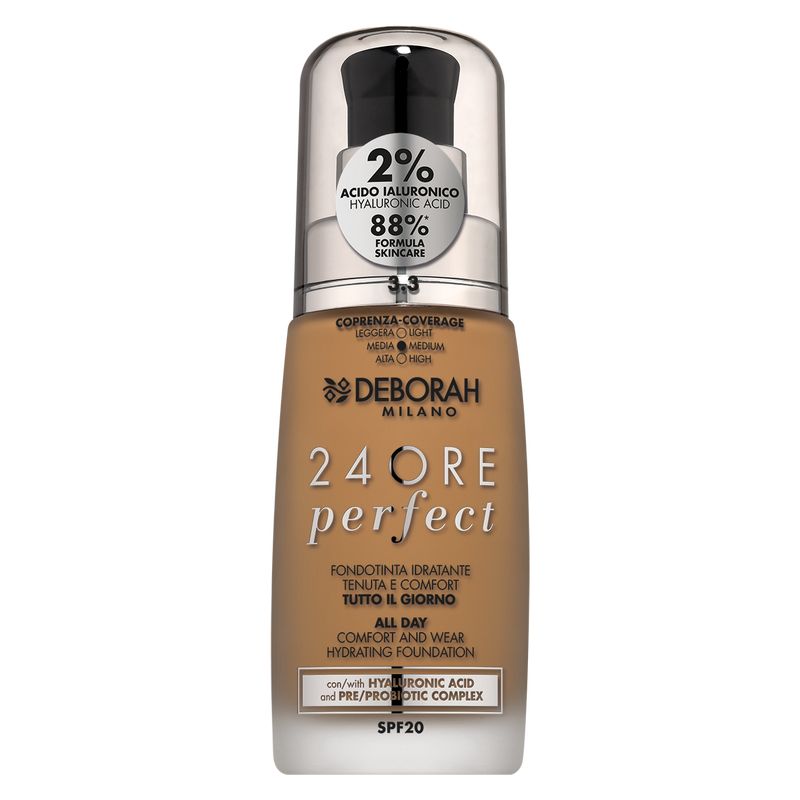 Fondotinta idratante tenuta e comfort tutto il giorno con 2% di Acido Ialuronico, 88%* di base skincare e pre/pro biotic complex. SPF 20. *percentuale della base di fondotinta con attività idratante prima dell’aggiunta del colore. Una nuova esperienza di make-up, che unisce expertise e performance ai benefici di un trattamento di bellezza, trasformando così la beauty routine quotidiana in un autentico momento di benessere: il fondotinta 24 ORE PERFECT esalta l’incarnato eliminando le imperfezioni, e al contempo dona alla pelle rinnovato splendore grazie agli ingredienti speciali della nuova formula con base skincare. I benefici dell’acido ialuronico (2%) dalle proprietà idratanti, rigeneranti e ristrutturanti sono stati combinati all’efficacia del pre e pro-biotic complex dall’azione equilibrante dell’ecosistema della pelle, protettiva e rafforzativa delle naturali difese dell’epidermide: una formulazione rivoluzionaria che agisce come un vero e proprio trattamento skincare per la cura e la bellezza della pelle. Inoltre il fattore di protezione SPF20contribuisce a diminuire i danni causati dai raggi UVB, prevenendo la comparsa di rughe ed inestetismi. La texture leggera e setosa si stende con facilità, fondendosi con l’incarnato senza creare l’effetto maschera, per un risultato eccezionale di lunga durata, all day long!