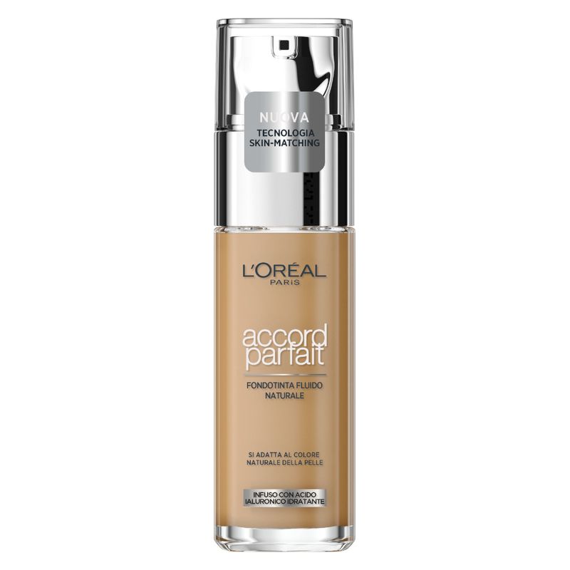 Fondotinta liquido con texture fondente, Effetto seconda pelle per una carnagione sublimata e omogenea, Coprenza modulabile e applicazione uniforme su pelli da secche a normali per nascondere le imperfezioni evitando l'effetto maschera - Nuova formula arricchita con acido ialuronico con l'80% di crema idratante per un'idratazione 24H, Protezione contro le aggressioni esterne (inquinamento e raggi solari), Texture fine che non unge, Non comedogenico - Consiglio: Agitare prima dell'uso, Stendere con un pennello o una spugnetta dopo aver applicato il correttore Accord Parfait per una routine di trucco completa - Flacone in vetro con dosatore, Disponibile in tantissime nuance per un risultato che si accorda perfettamente alla texture e alle tonalità naturali della tua pelle, Coprenza senza demarcazioni tra fondotinta e pelle del viso - Contenuto: 1x Fondotinta liquido Accord Parfait L'Oréal Paris, Quantità: 30 ml